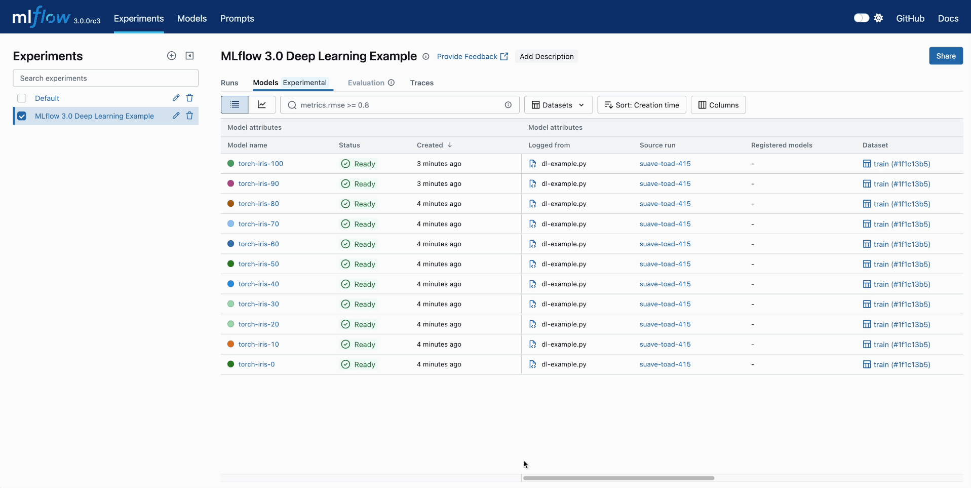Track your all your DL checkpoints across epochs using the MLflow UI. Compare performance and quickly find the best checkpoints based on any metrics.