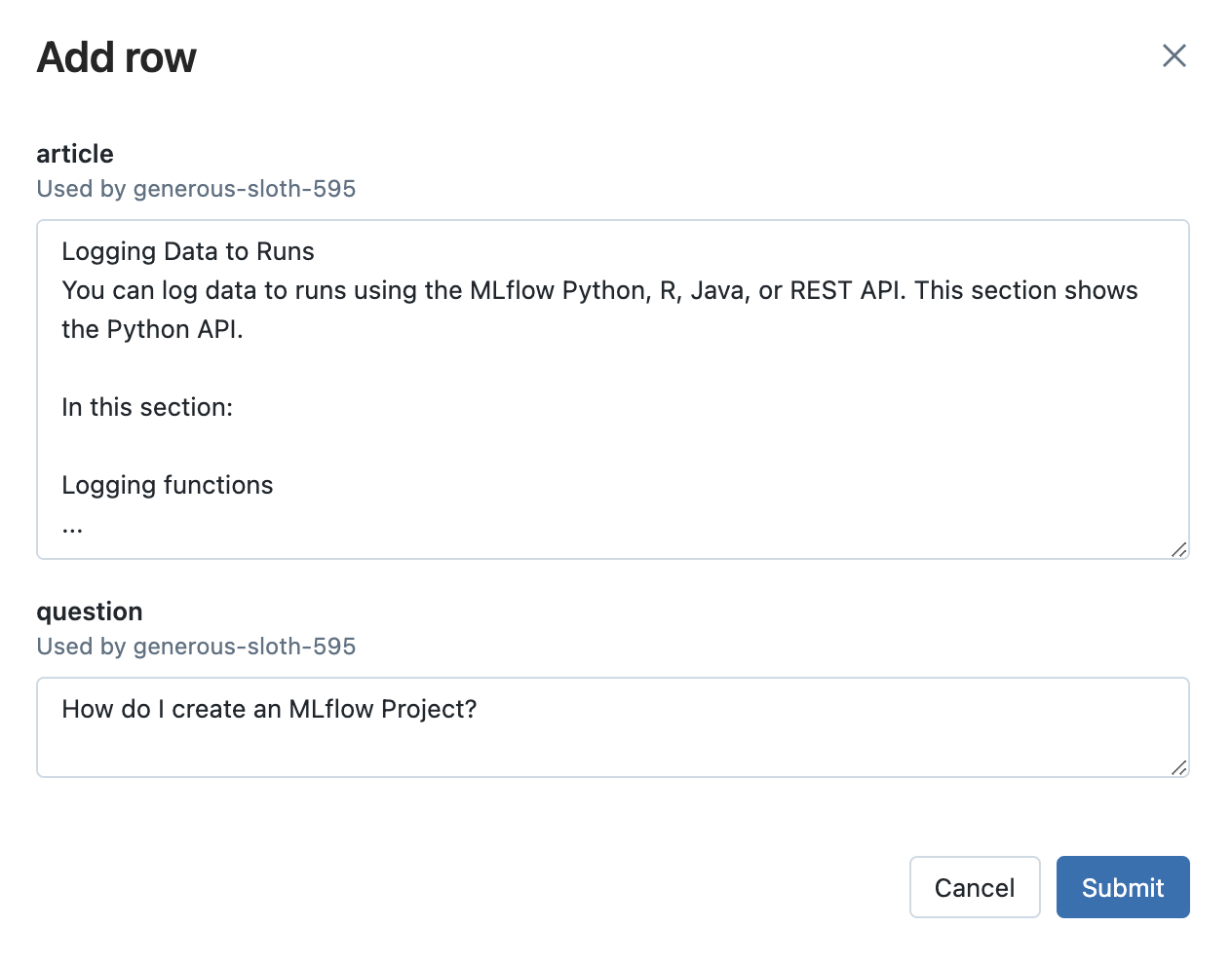 - Click the Add Row button and fill in a value(s) your prompt template's input variable(s). For example, in the MLflow documentation use case, you can try asking a question unrelated to MLflow to see how the LLM responds. This is important to ensure that the application is robust to irrelevant inputs.