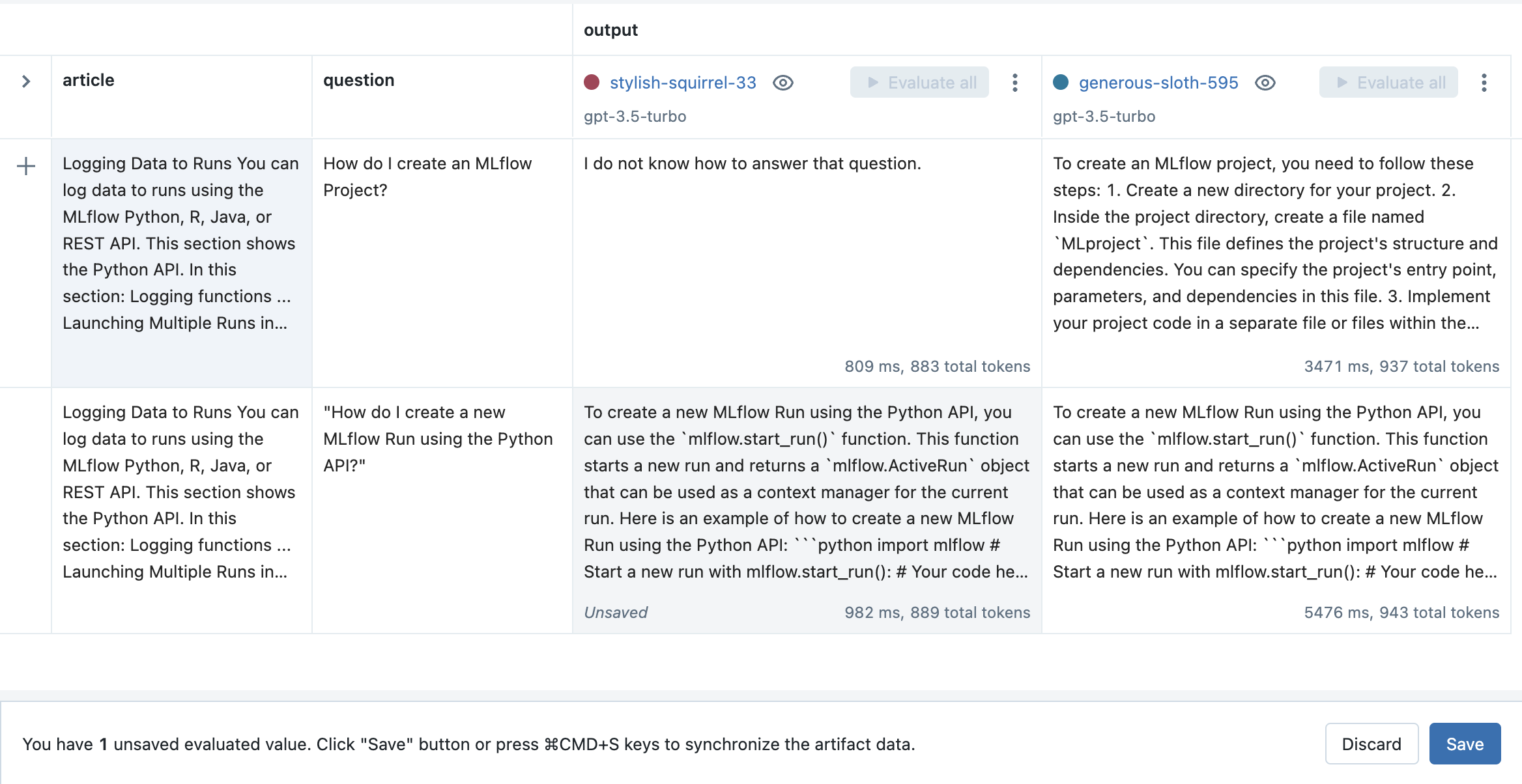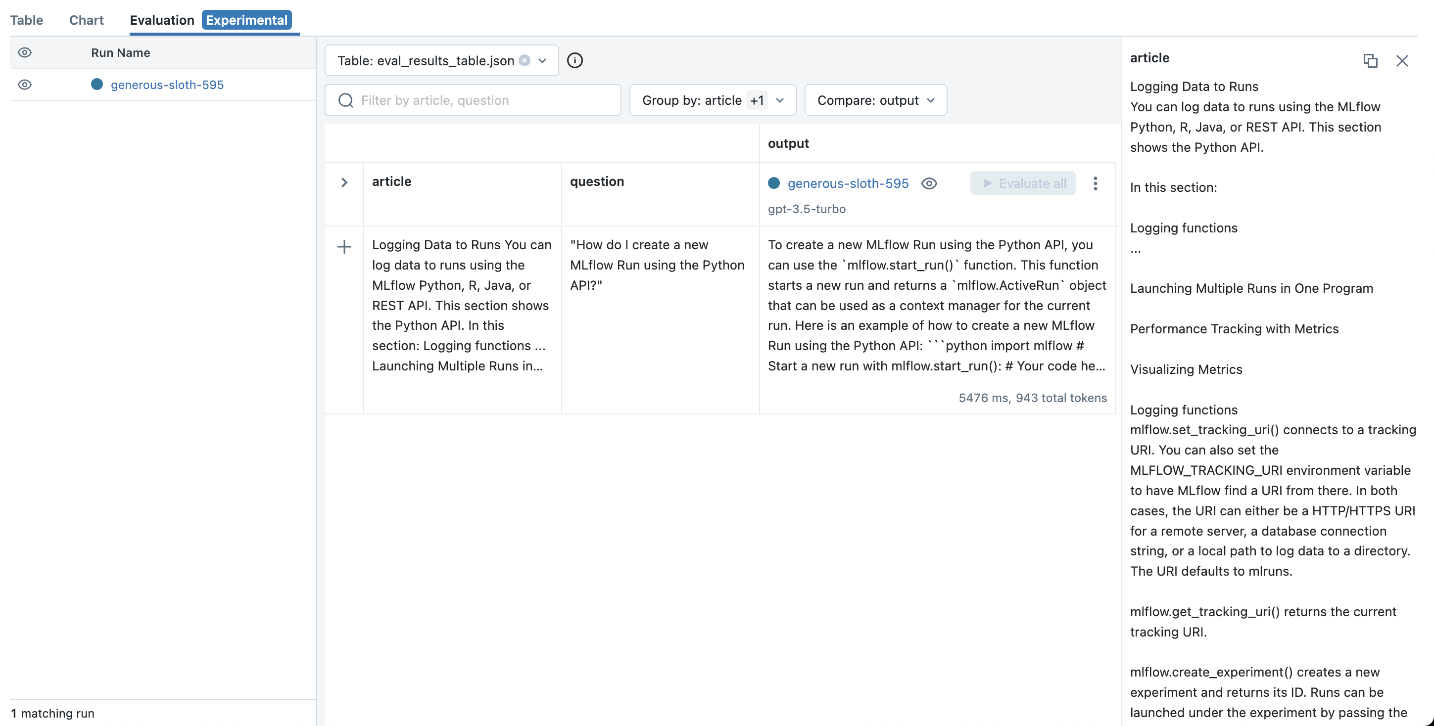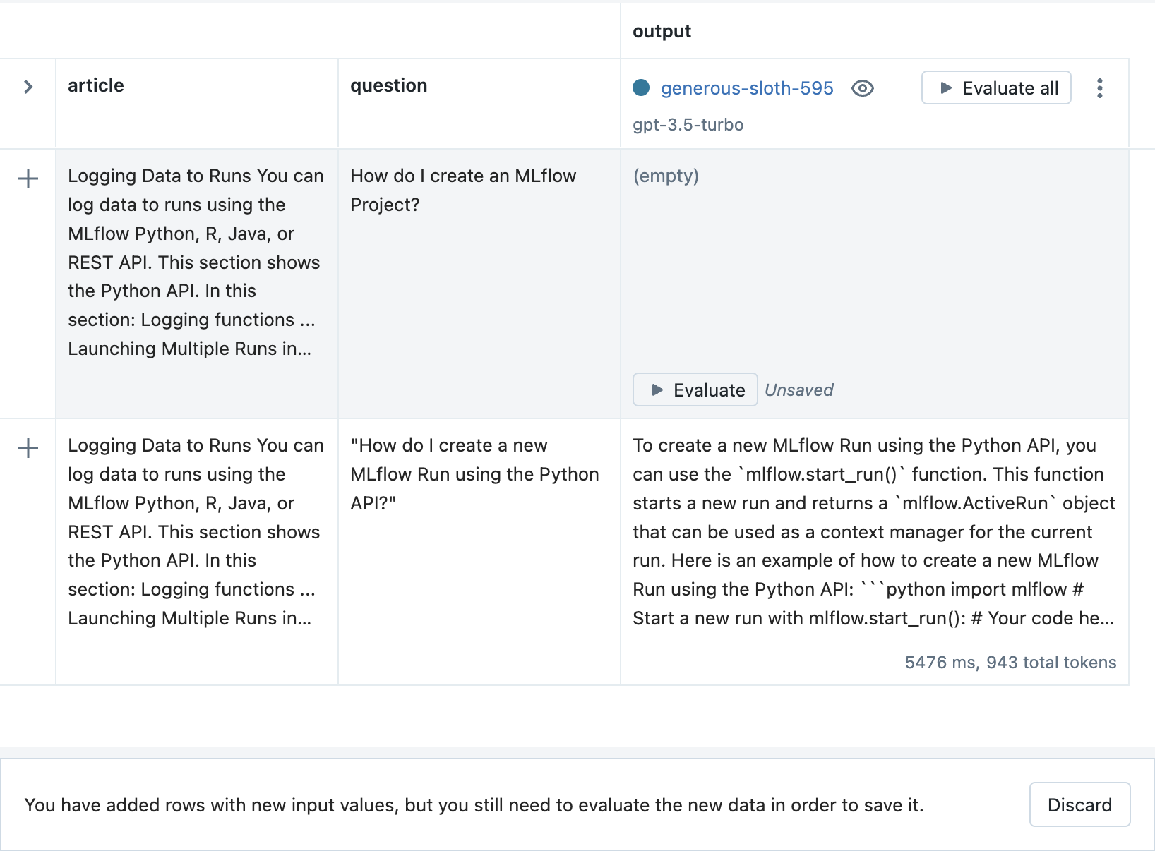 From the Evaluation tab, click the Evaluate all button next to the new Run to evaluate all of the previous inputs.