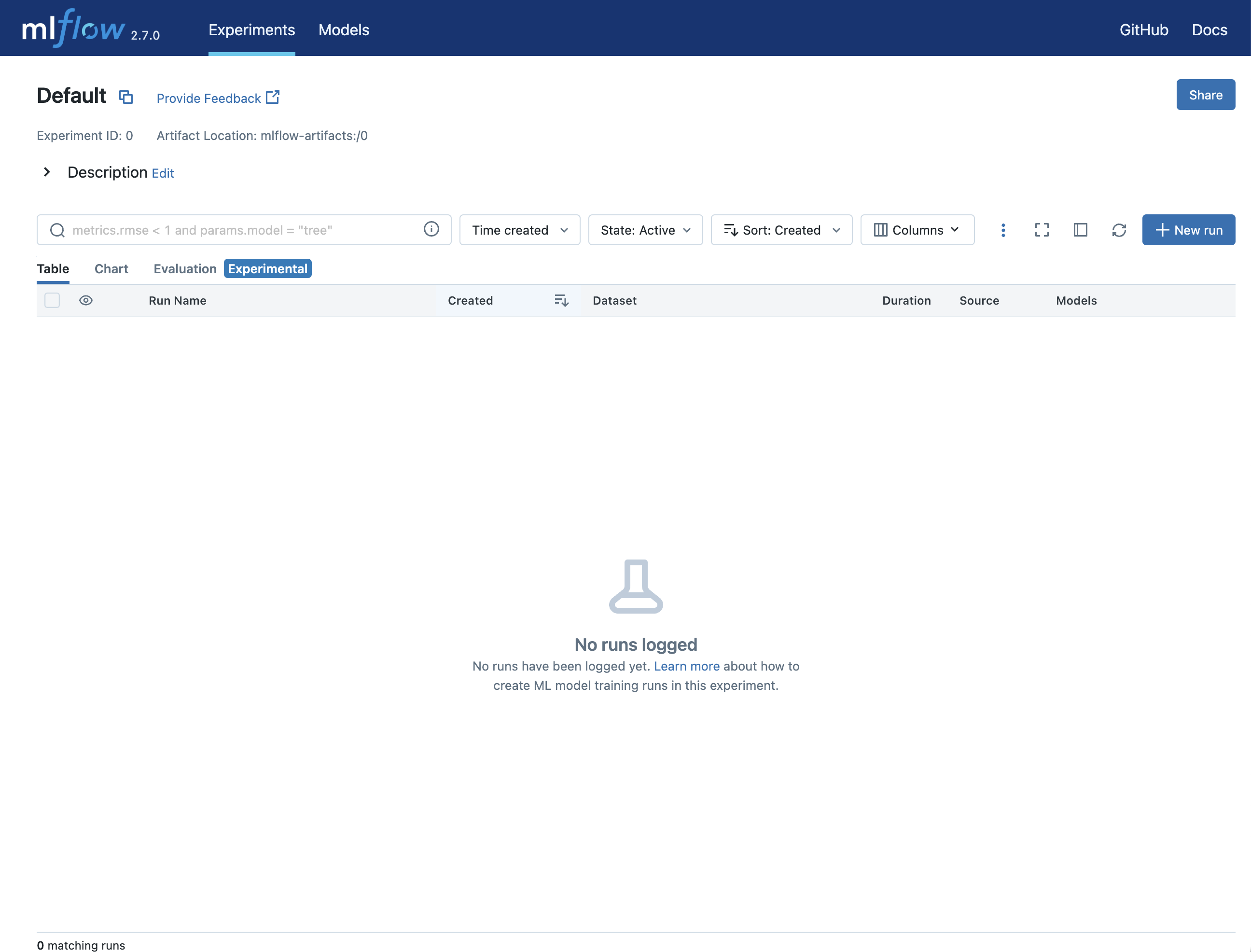 Next, open an existing MLflow Experiment in the MLflow UI, or create a new experiment.