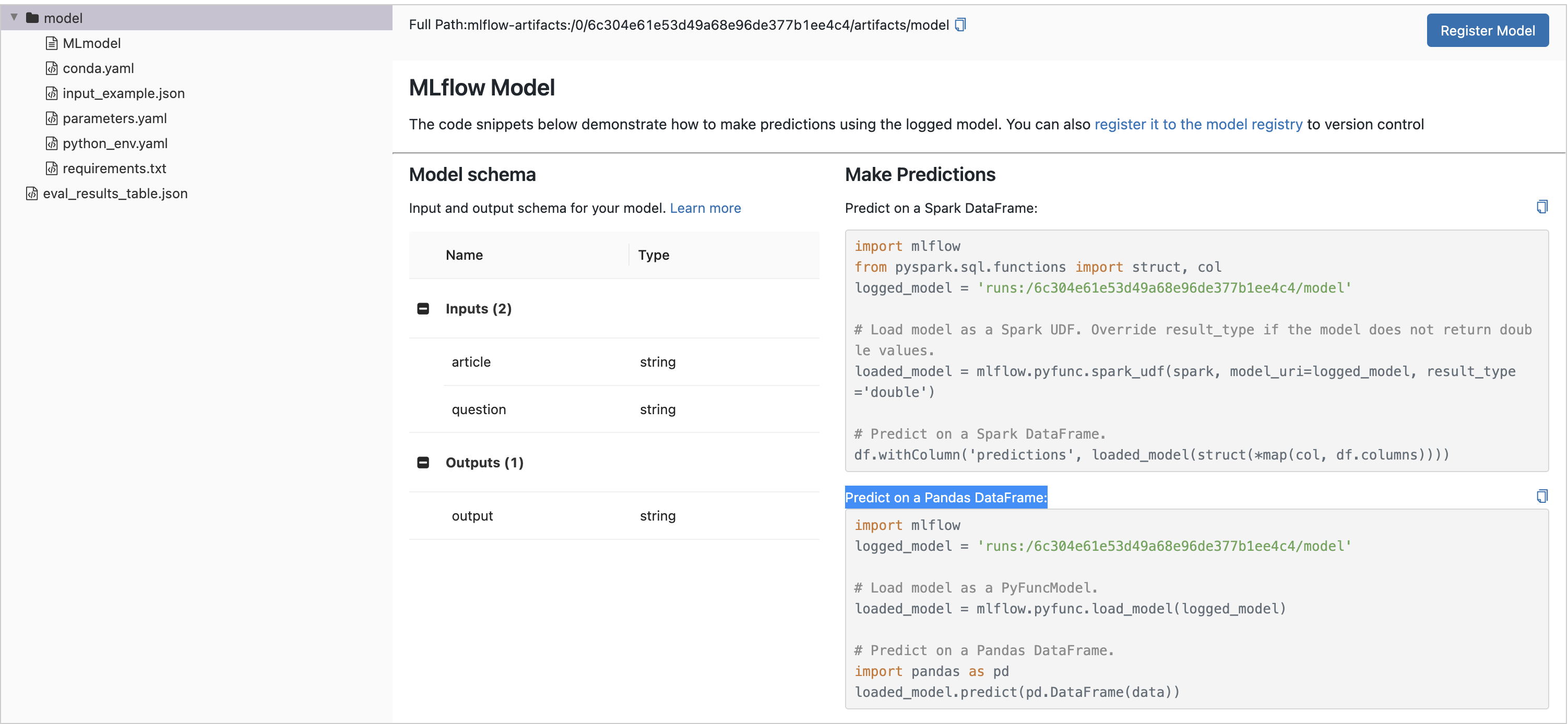 To load the MLflow Model in a notebook for batch inference, click on the Run's name to open the Run Page and select the model directory in the Artifact Viewer. Then, copy the first few lines of code from the Predict on a Pandas DataFrame section and run them in a Python environment of your choosing, for example: