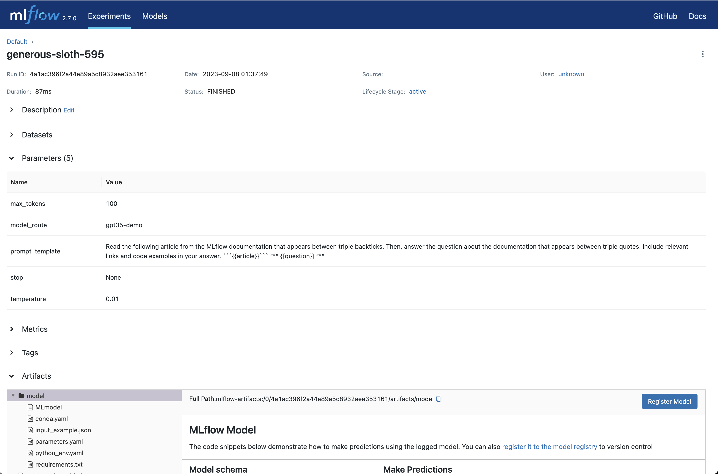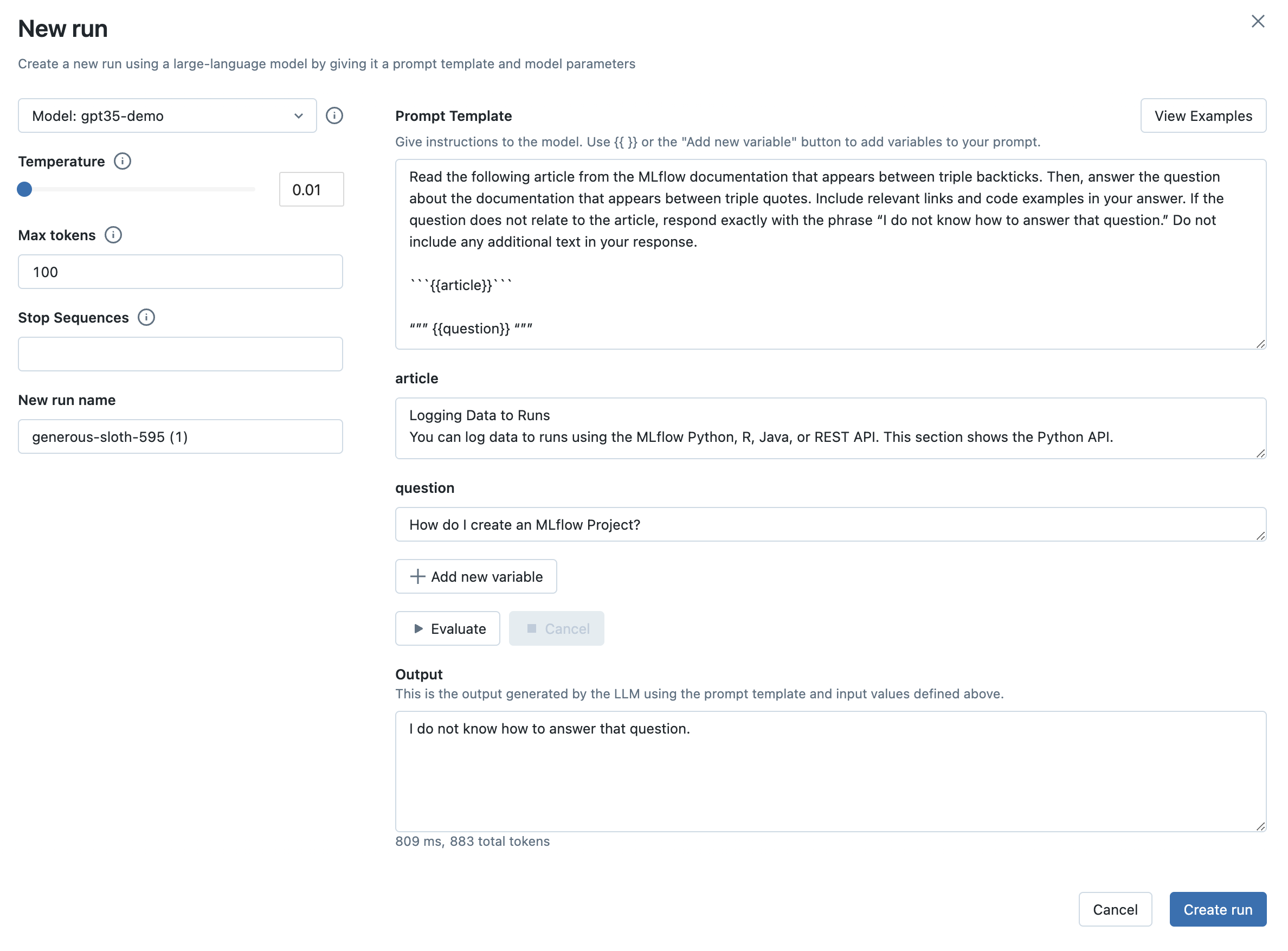 Once you're satisfied with your chosen prompt template and parameters, click the Create Run button to store this information, along with your choice of LLM, as an MLflow Run. This will create a new Run with the prompt template, parameters, and choice of LLM stored as Run params. It will also automatically create an MLflow Model with this information that can be used for batch or real-time inference.