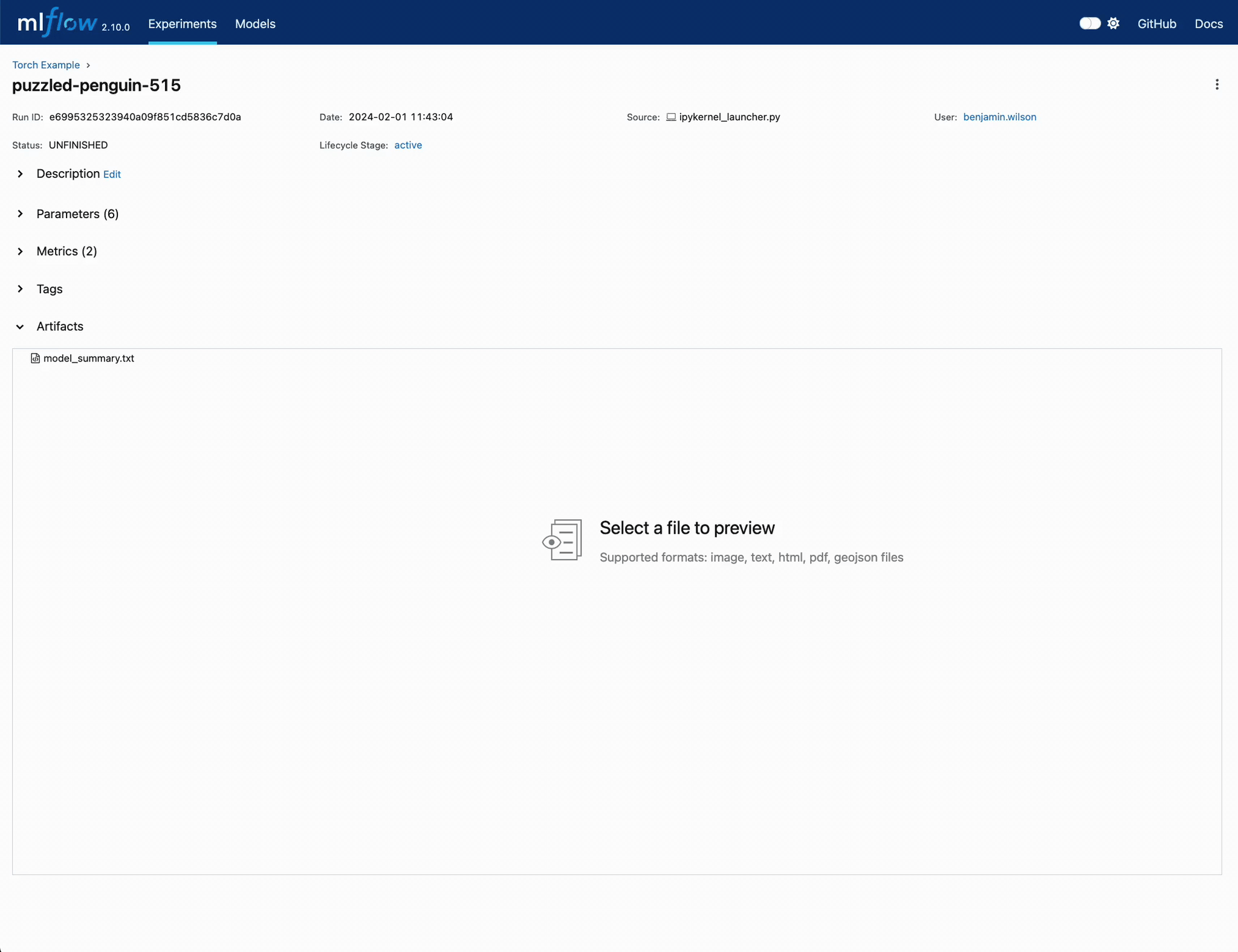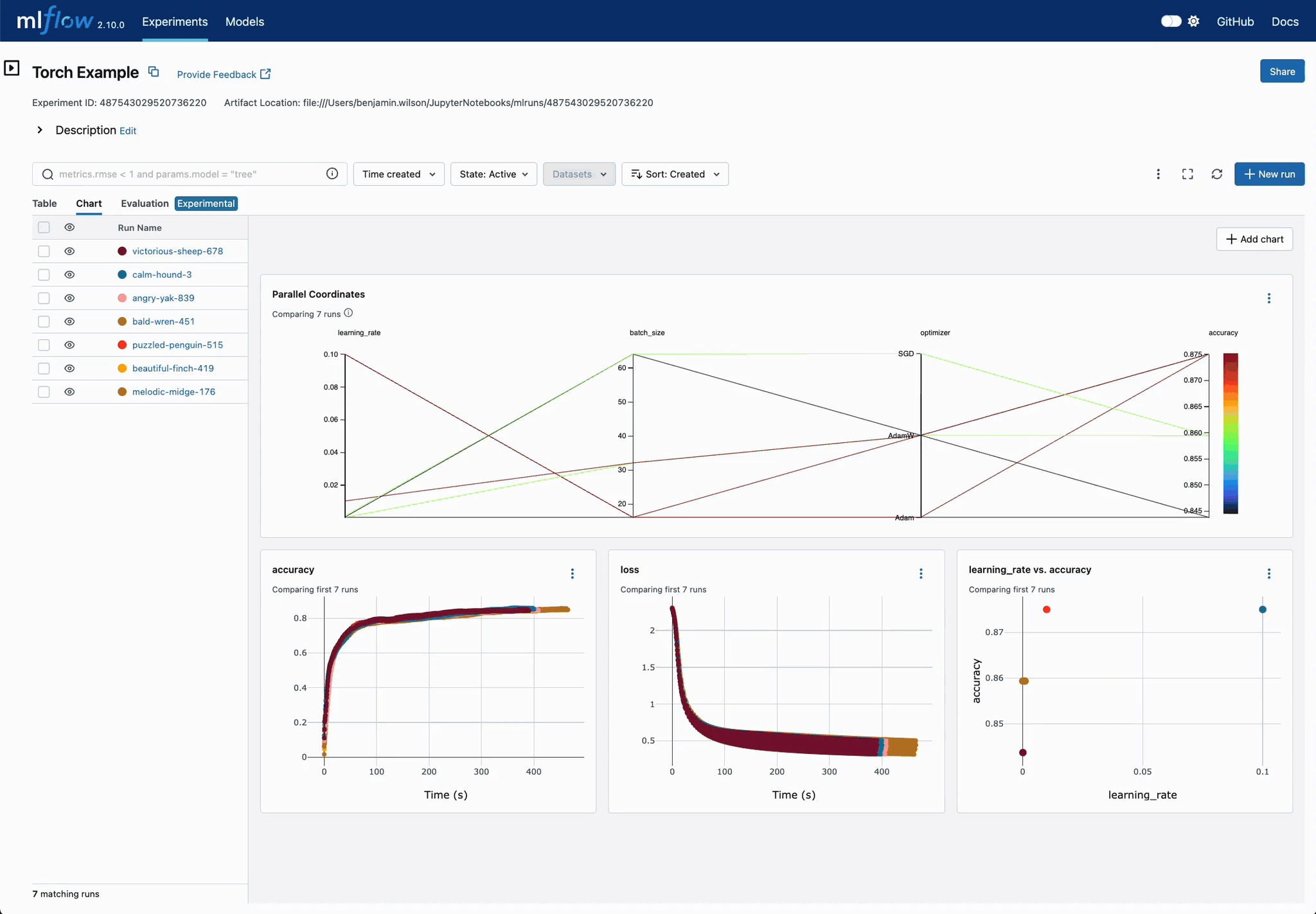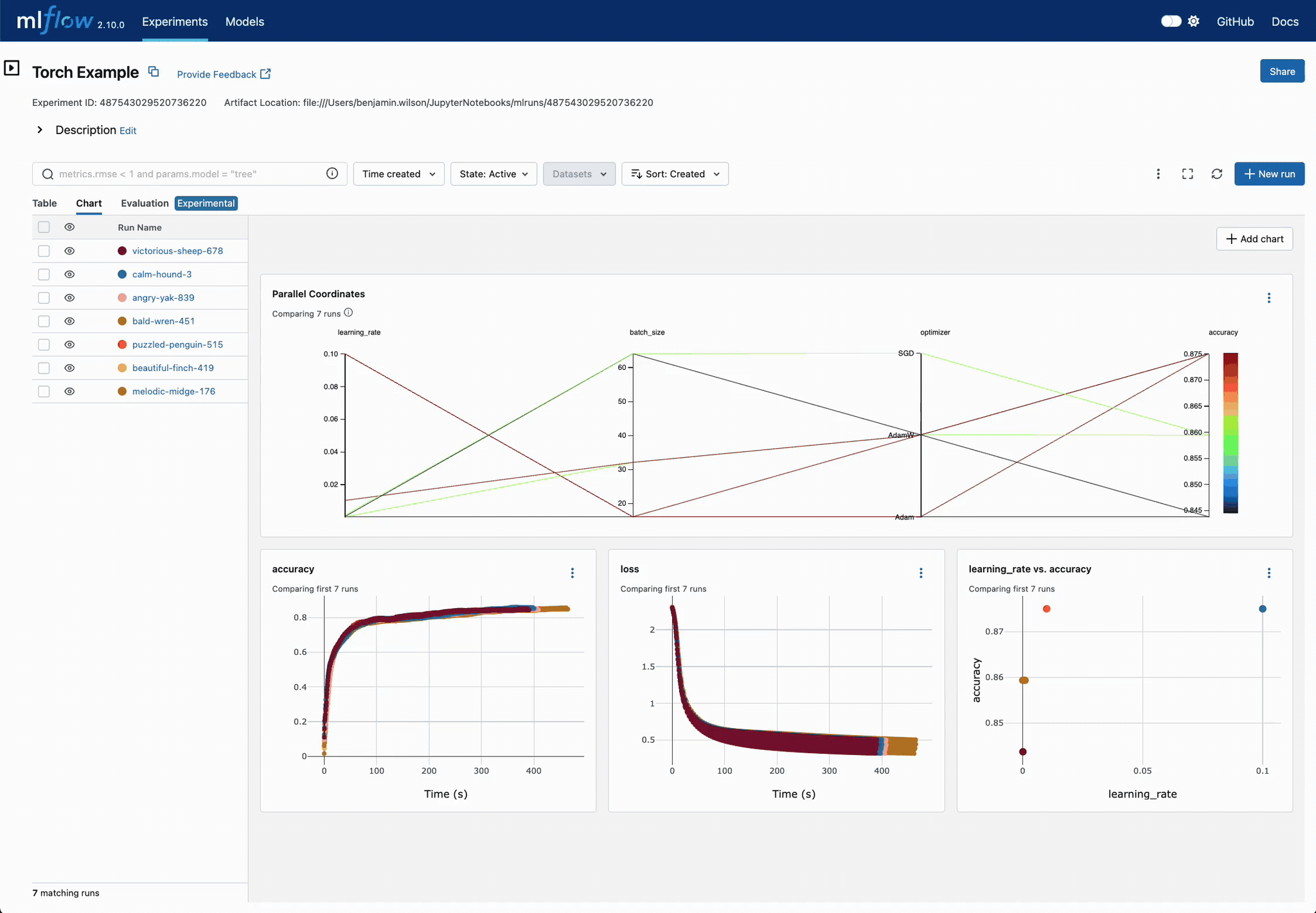 - Experiments Tracking: MLflow tracks your deep learning experiments, including parameters, metrics, and models. Your experiments will be stored in the MLflow server, so you can compare across different experiments and share them.