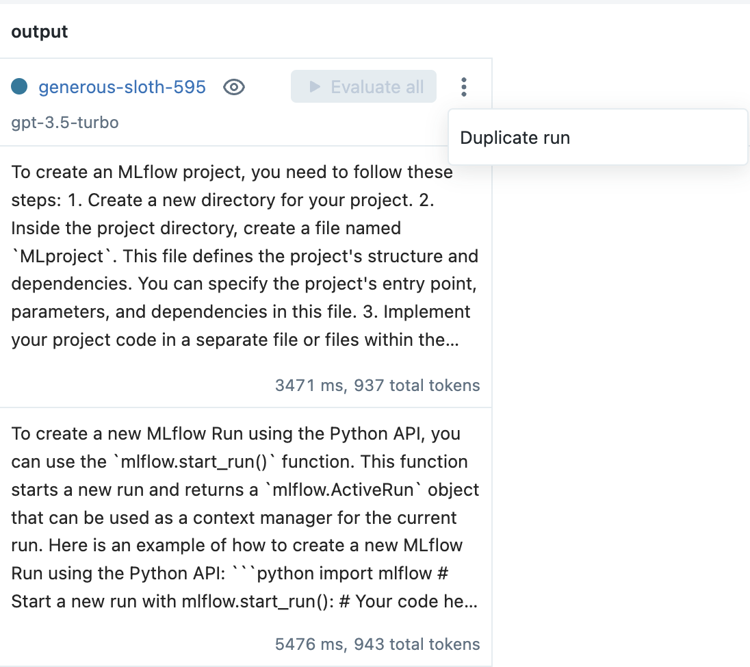 To improve performance, create a new Run by selecting the Duplicate run option from the context menu. For example, in the MLflow documentation use case, adding the following text to the prompt template helps improve robustness to irrelevant questions: