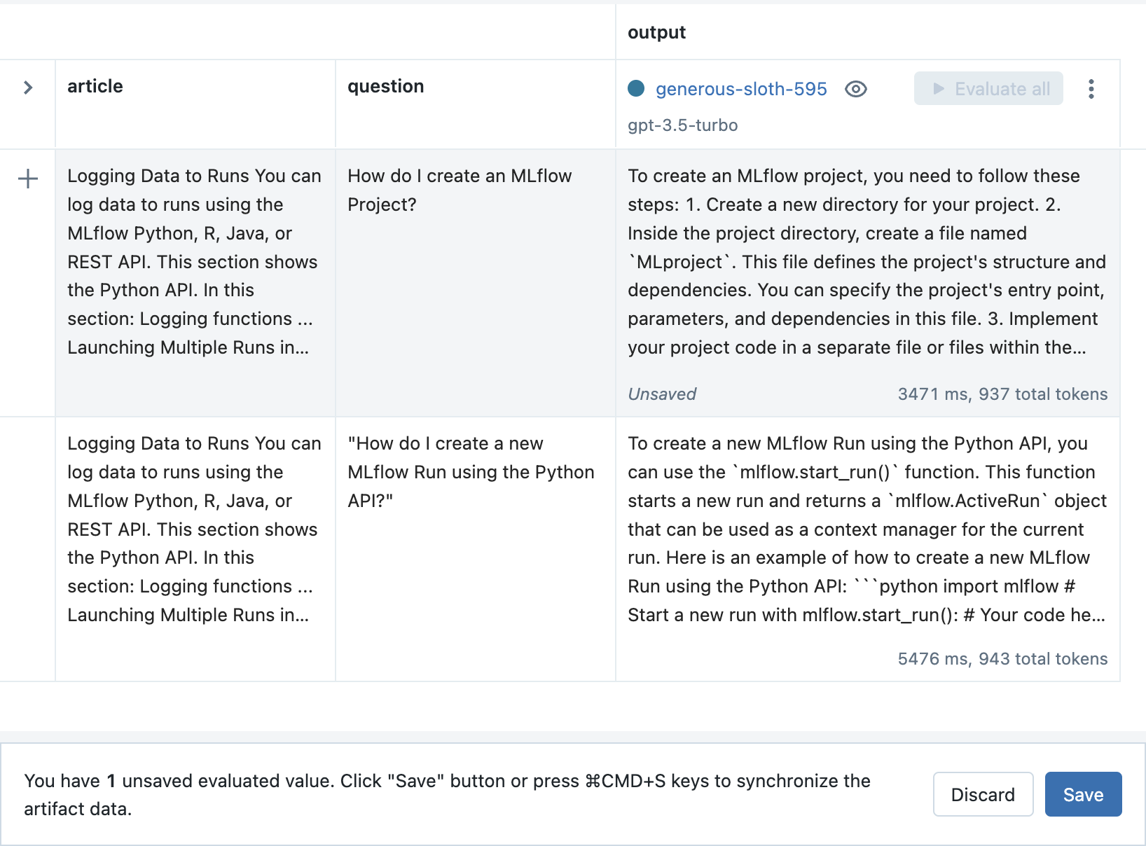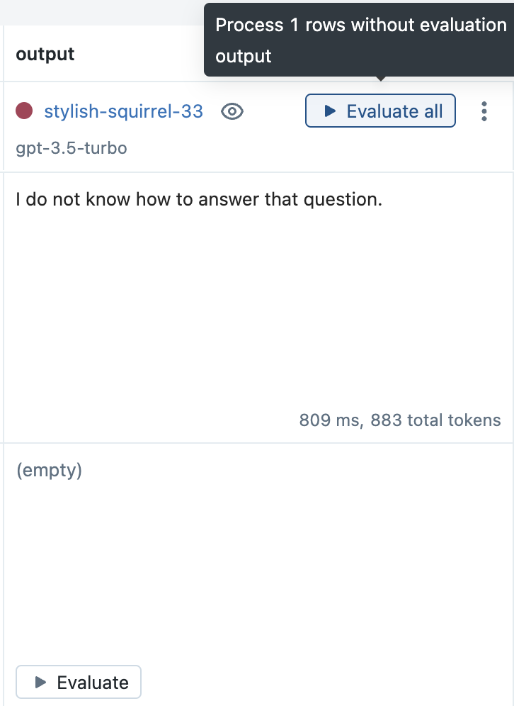 From the Evaluation tab, click the Evaluate all button next to the new Run to evaluate all of the previous inputs.