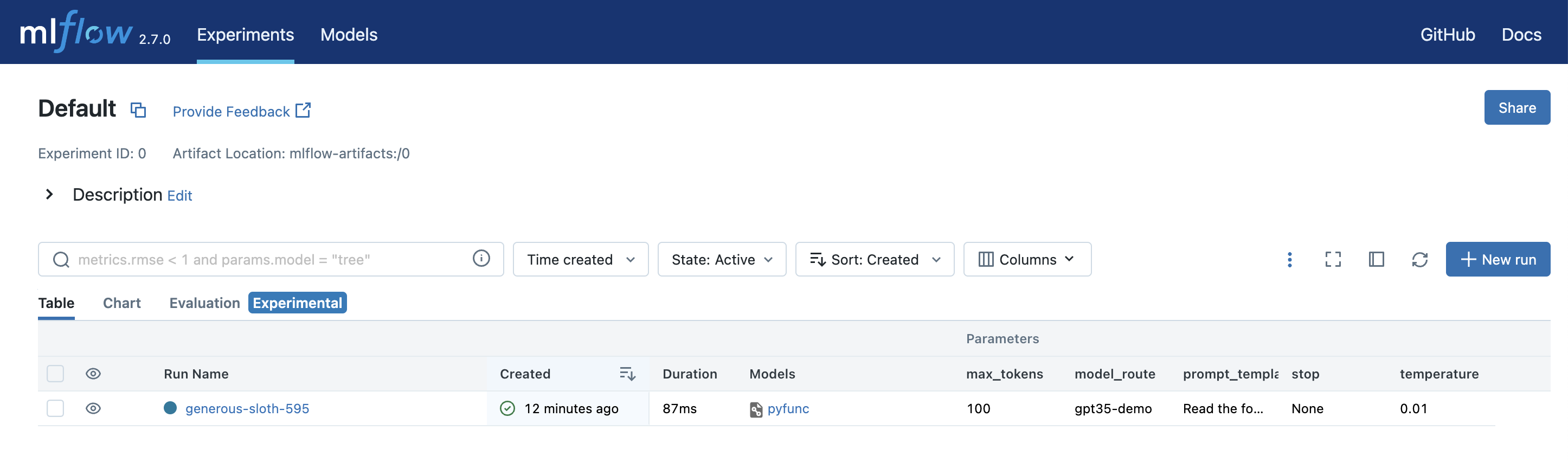 Next, open an existing MLflow Experiment in the MLflow UI, or create a new experiment.