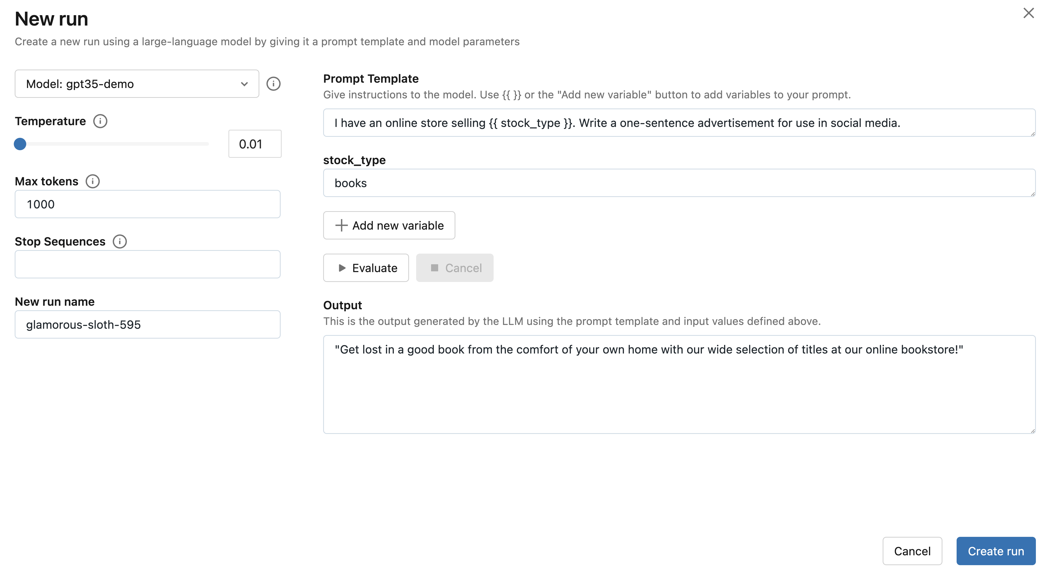 Finally, click the Evaluate button to see the new output. You can also try choosing a larger value of temperature to observe how the LLM's output changes.