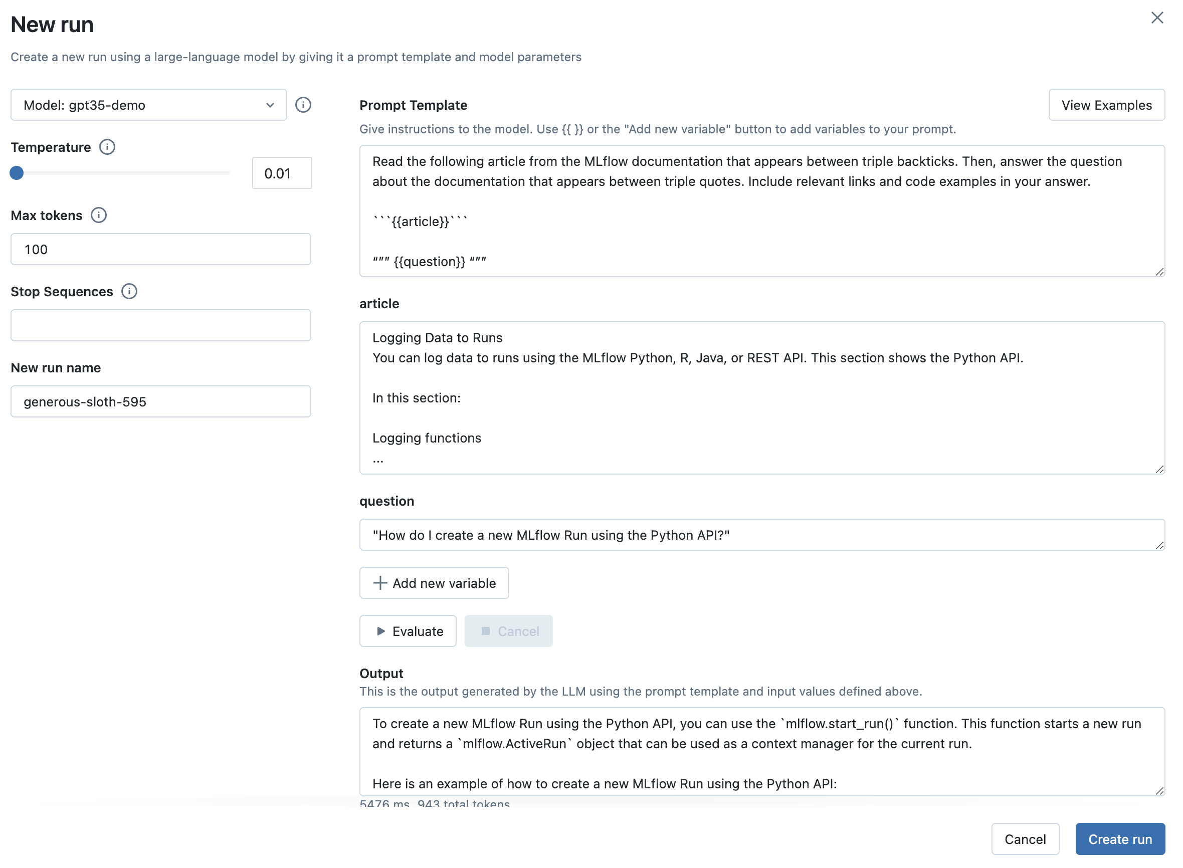 Once you're satisfied with your chosen prompt template and parameters, click the Create Run button to store this information, along with your choice of LLM, as an MLflow Run. This will create a new Run with the prompt template, parameters, and choice of LLM stored as Run params. It will also automatically create an MLflow Model with this information that can be used for batch or real-time inference.