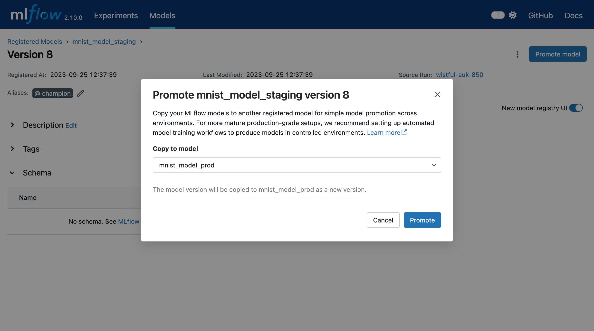 • For simple model promotion use cases, you can first register your MLflow models under the dev registered model and then promote models across environments using the copy_model_version() client API.