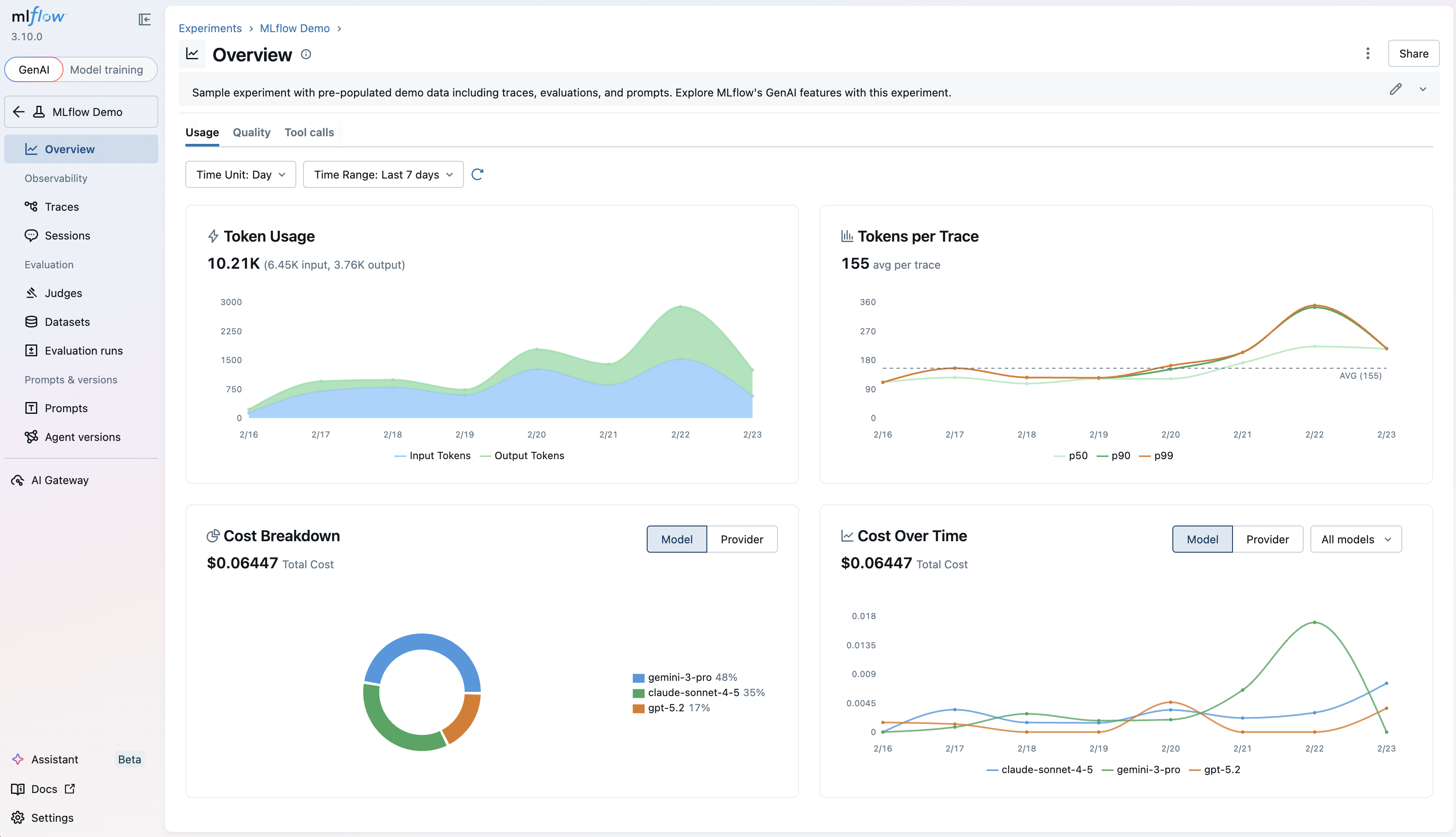 New to MLflow GenAI? With one click, launch a pre-populated demo and explore LLM tracing, evaluation, and prompt management in action. No configuration, no code required. This feature is available in the MLflow UI's homepage, and provides a comprehensive overview of the different functionality that MLflow has to offer.